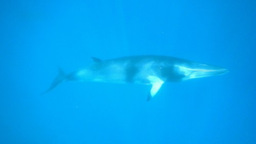 The dwarf minke whale (Balaenoptera acutorostrata subspecies) occurs only in the southern hemisphere, and the Great Barrier Reef provides habitat for their only known reliable aggregation in the world. Dwarf minke whales grow to a maximum of around 8m, with adults weighing around 5-6 tonnes. They have a characteristic white blaze on their flippers and shoulders, contrasting with their dark grey top color. They have two blowholes, like all baleen whales.