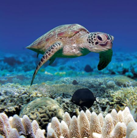 The Green Sea Turtle (Chelonia mydas) is found in the tropical waters around the Great Barrier Reef. They have a