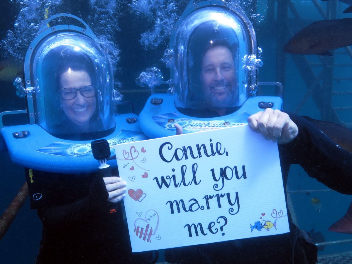 On the holiday of a lifetime to Australia from Alabama USA, Andrew had a secret plan to surprise his sweetheart, Connie. Meticulously and secretly planned before arriving in Australia, it was 4 metres (about 13ft) below the water in an Oceanwalker helmet dive in the Great Barrier Reef that Andrew popped the question! Now that’s taking the plunge!