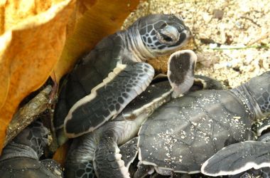 An interesting fact about marine turtles is that the temperature of the surrounding sand will determine the sex of the offspring. Cooler sand produces male turtles, while warmer sand produces females. Green turtles can lay up to 100 eggs at a time, which will incubate for up to three months. Several weeks after mating, the females will drag their bodies ashore to dig a hole in the sand above the high water mark to lay their leathery eggs. After the eggs are covered, she will have no further contact with her offspring.