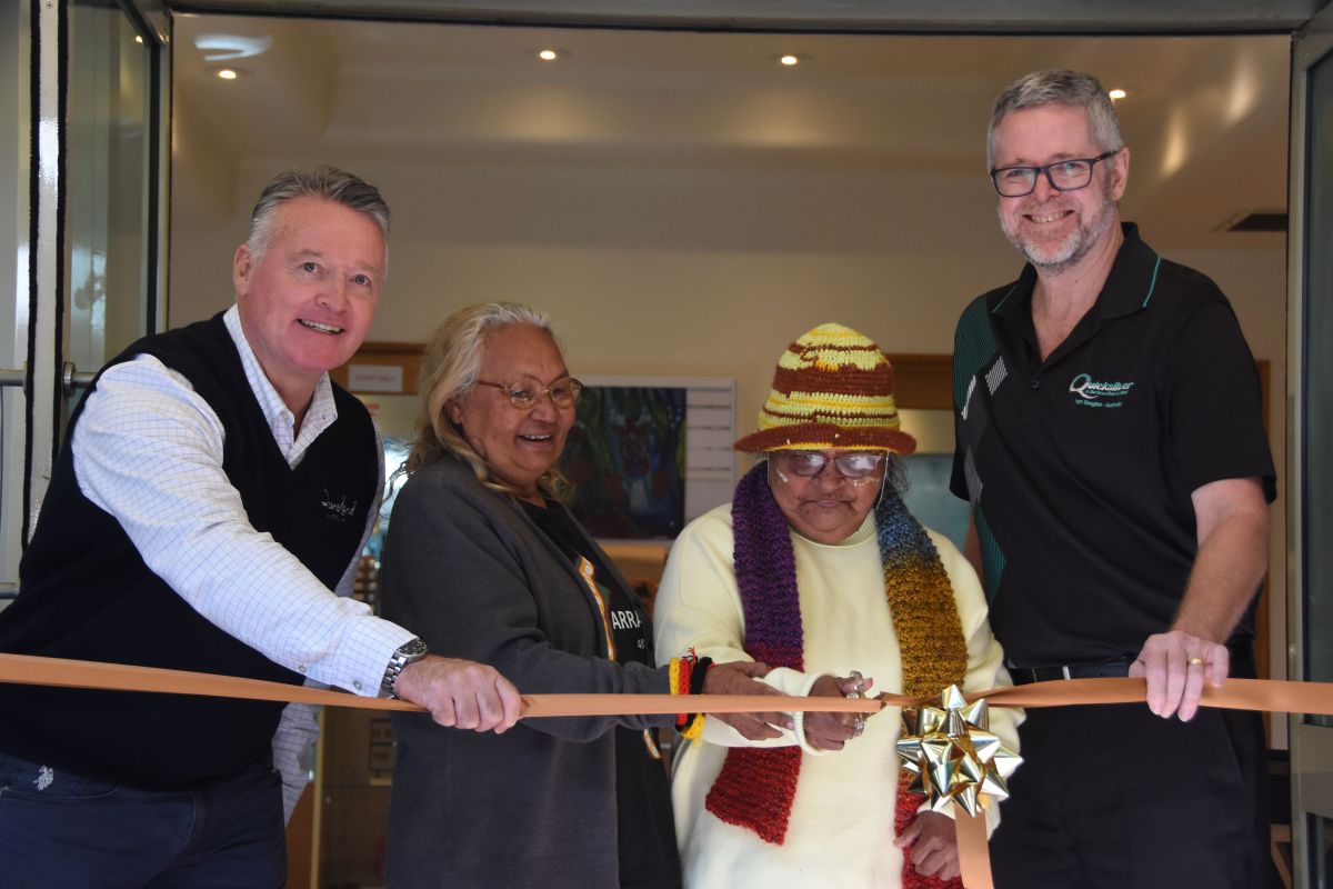 Main photo: Pictured left to right cutting the ribbon to the Black Seahorse Shop are Michael Healy, Gunggandji Elders June Noble and Dorita Wilson, Tony Baker.